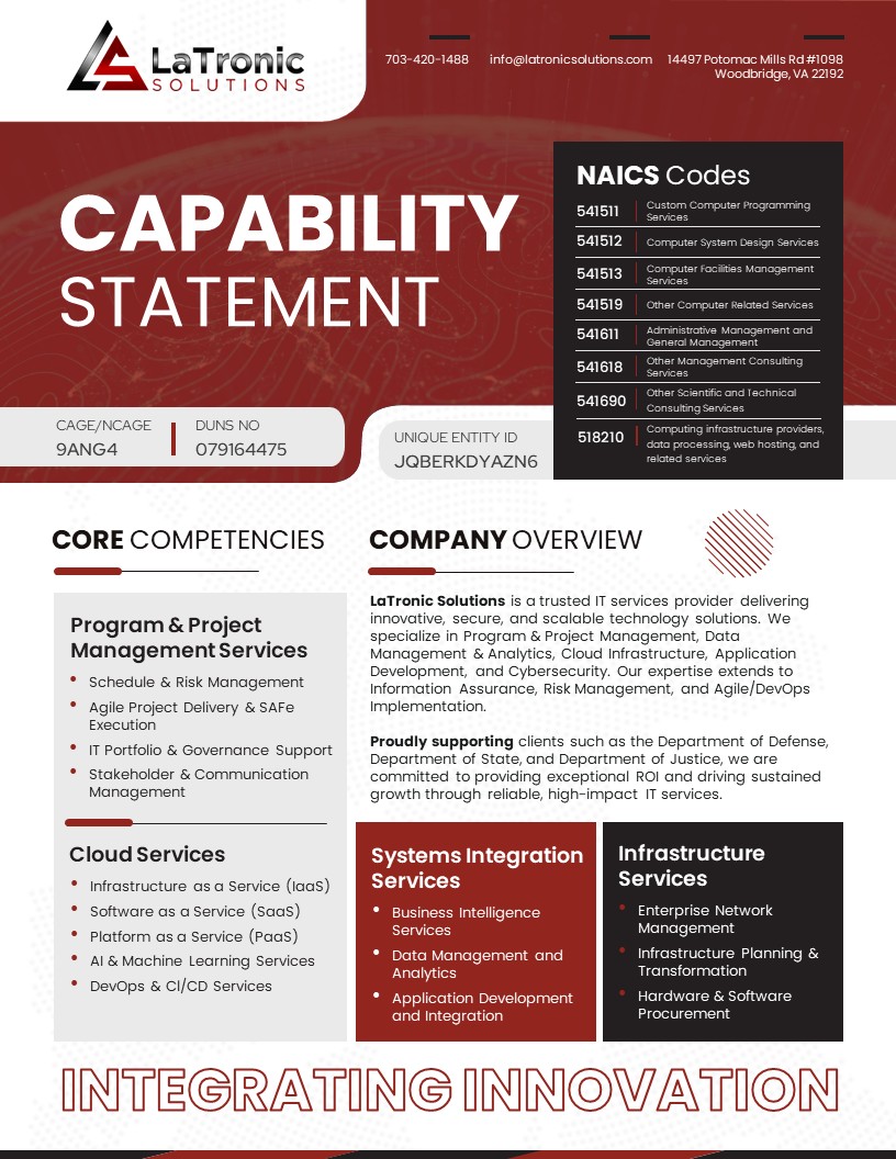 Discover our range of services designed to support your end-to-end technology journey. From Program & Project Management and Cloud Services to System Integration and Infrastructure Services, LaTronic Solutions delivers the expertise, reliability, and innovation your business needs to operate efficiently and scale with confidence.